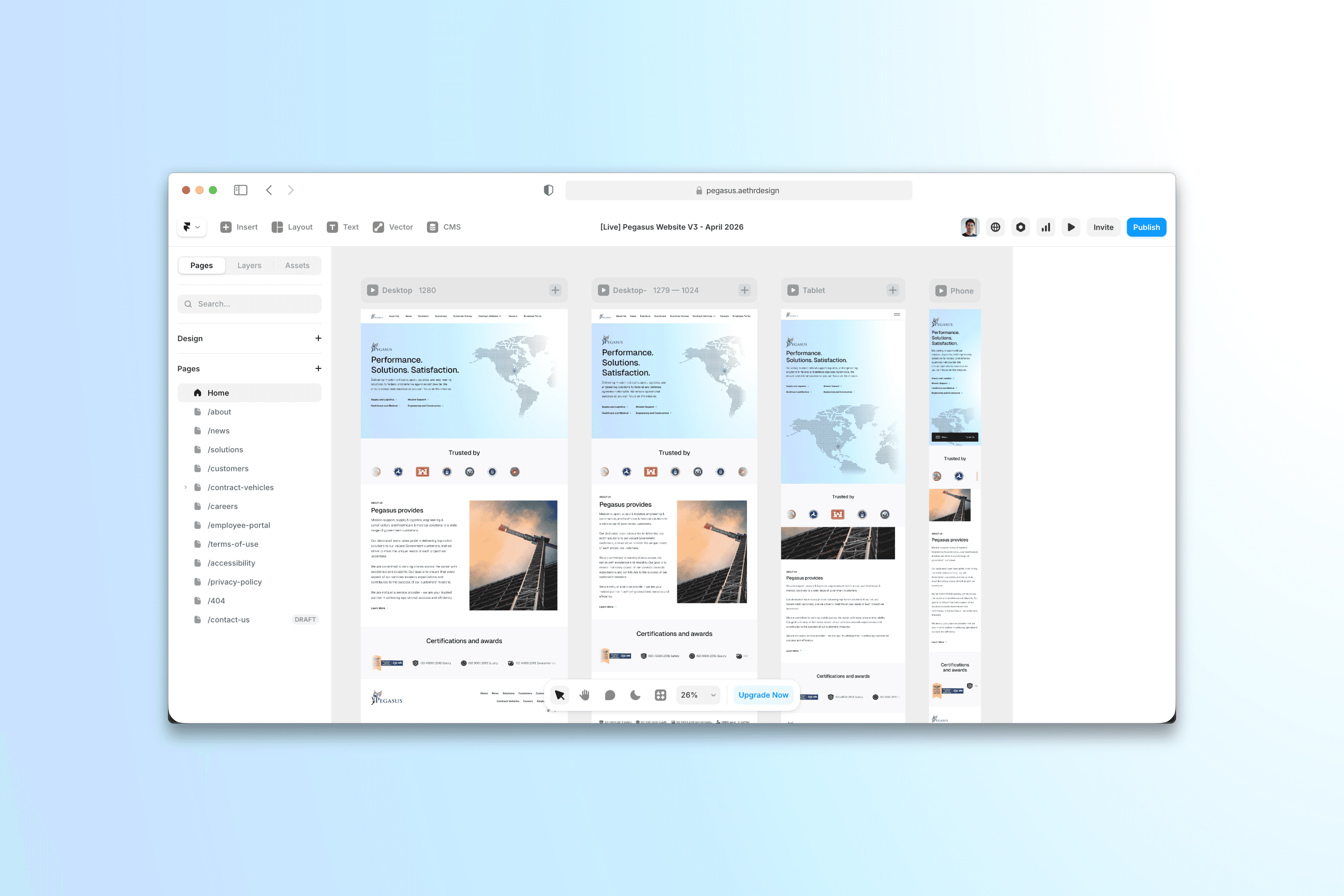 Pegasus Support Services needed more than a simple redesign. In the federal contracting space, a digital presence must signal absolute credibility before a single word is read. Their legacy static site was a structural liability—visually dated and entirely reliant on developers for even minor updates. They required an enterprise-grade transformation that paired top-tier management consulting aesthetics with a highly scalable, autonomous backend.